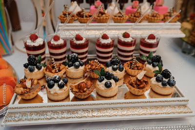 An Exquisite Display of Elegant Desserts Featuring Tartlets, Creams, and Fresh Fruits