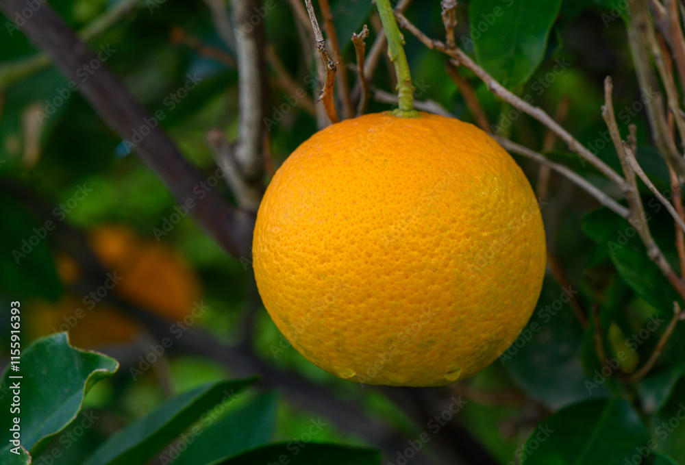 Bright orange fruit hanging from a lush green tree branch in a warm orchard environment