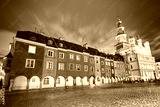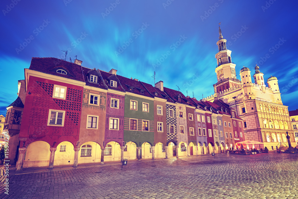 Vintage toned Old Market Square in Poznan at night.