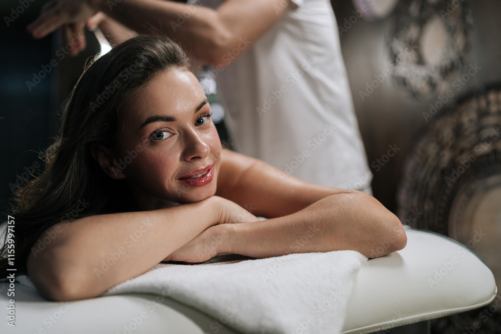 Close-up portrait of pretty female client getting luxury back massage lying on massage table smiling looking at camera . Professional masseuse performing therapeutic massage on relaxed woman.