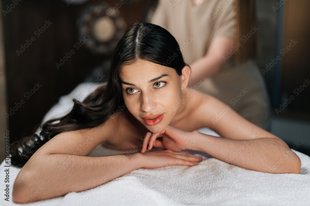 Portrait of serene female client getting relaxing back massage from professional massage therapist while lying resting on table, experiencing therapeutic wellness at luxurious spa setting, close-up.