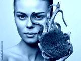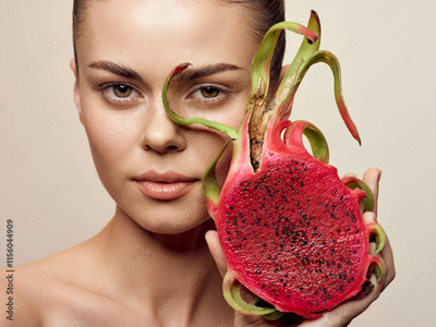 Closeup portrait of a beautiful young woman with dragon fruit slices on her face, on beige background
