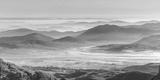 Low lying clouds and mist covering the landscape at sunrise, creating a beautiful pastel coloured scene