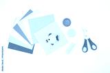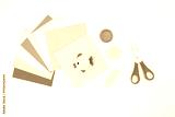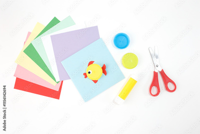 develop motor coordination ideas for kids, recycled art project reuse everyday items, plastic bottle caps in different shapes of abstract animals on color paper squares, top view white background,