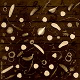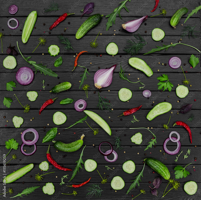 Flat lay composition with cucumber, onion, aromatic herbs and ar