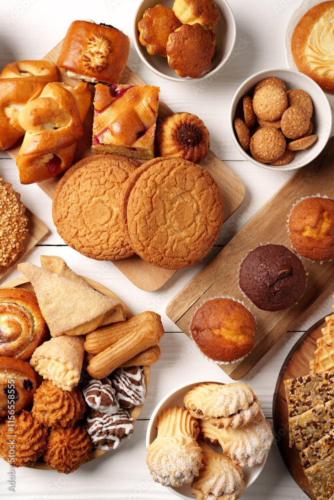 Assorted baked goods displayed on a wooden table, featuring cookies, pastries, and muffins in a cozy setting
