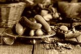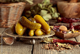 Pickled cucumbers with ingredients on an old wooden table.