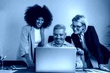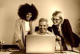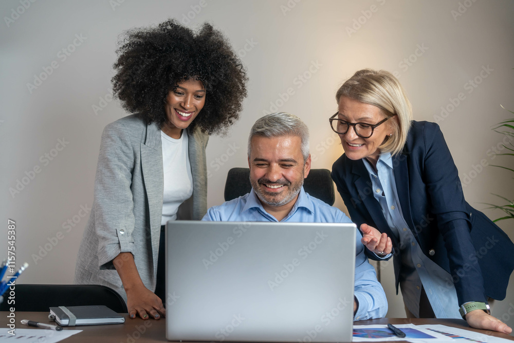 Small group of smiling diverse businesspeople using a laptop together at work. Sits by the table with laptops. Confident business people in formal clothes working in the office.