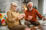 senior couple husband and wife play cards at home in bright day