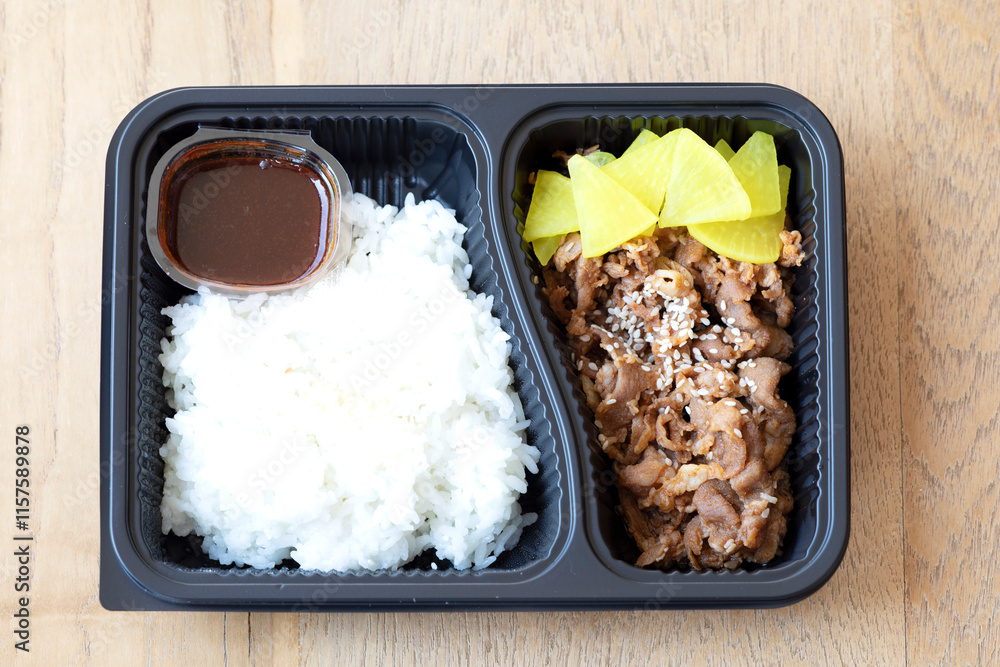 Rice with stir-fried pork and sauce in black plastic bowl on wooden table.