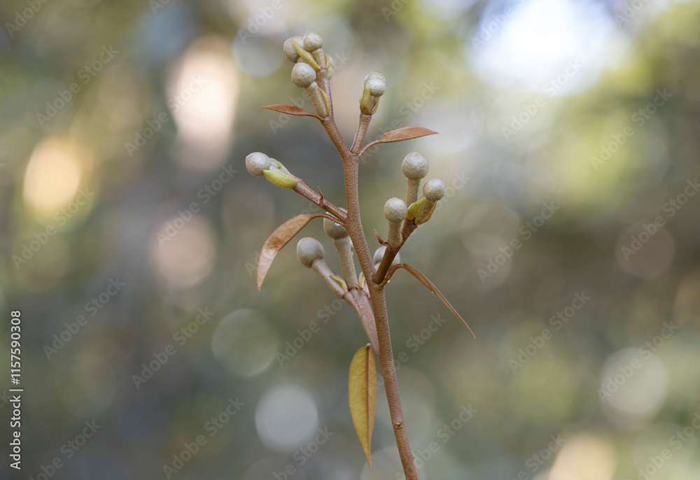 Cluster of young durian flower buds on branch with bokeh in background (Selective focused)