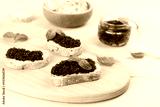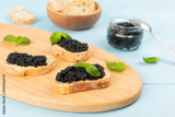 Bread slice with black caviar served on on wooden table