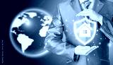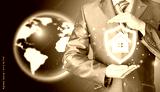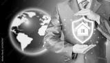 House protection and insurance. Home shield. Real estate safety. Globe background. World wide insurance.
