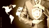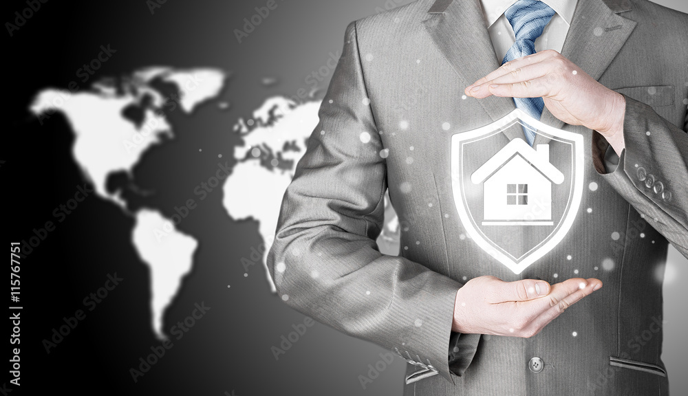 House protection and insurance. Home shield. Real estate safety. World map background. Worldwide insurance.
