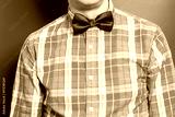 Man Dressed Checkered Shirt With Black Bow Tie On Gray