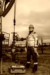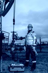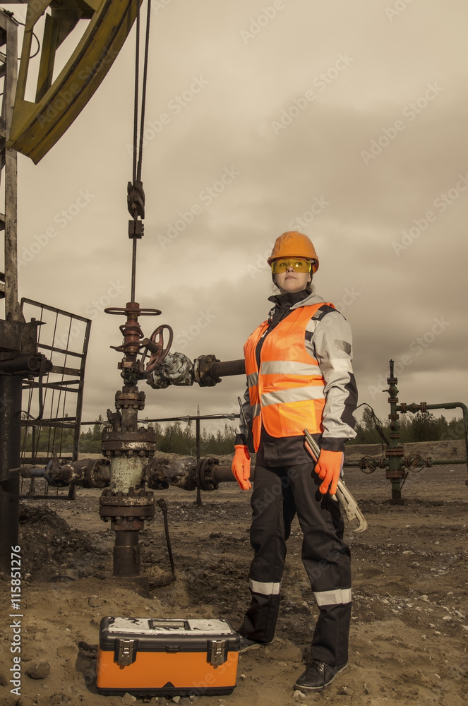Woman engineer in the oil field with the wrench and toolbox wearing orange helmet and work clothes. Pump jack background. Oil and gas concept. Toned.