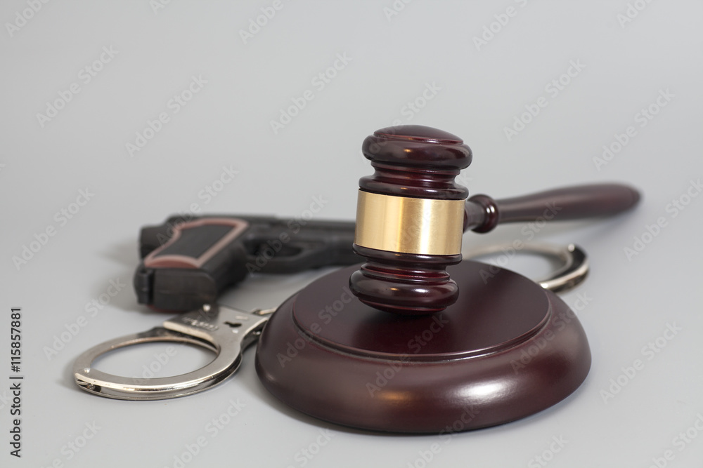judge's gavel, handgun and handcuffs isolated on gray background