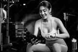 Asian woman resting on bench and checking all updates after exercising in gym interior, female mobile phone and smart watch application during training at fitness gym, sport workout healthy lifestyle