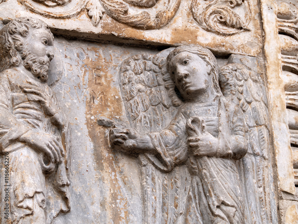San Zeno Basilica Church in Verona Italy, detail of exterior sculptures and bas relief