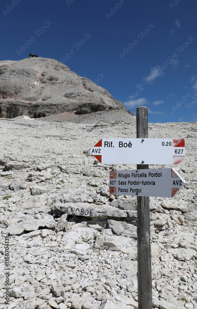 signs with arrows and Italian directions for locations and alpine huts in Northern Italy on the Alps