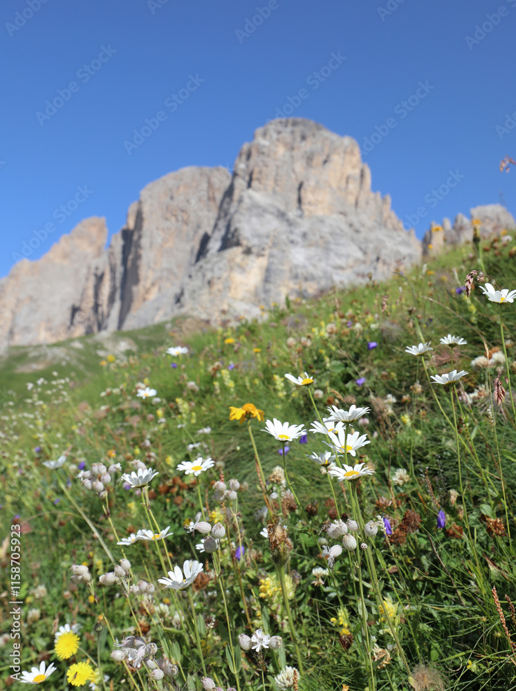 alpine flora with blooming flowers in summer and the rocky mountains I in the background