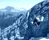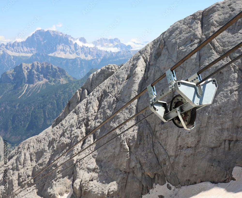 detail of the pulley and steel cable of the funicular system for the transport of goods and people on the European ALPS in Italy