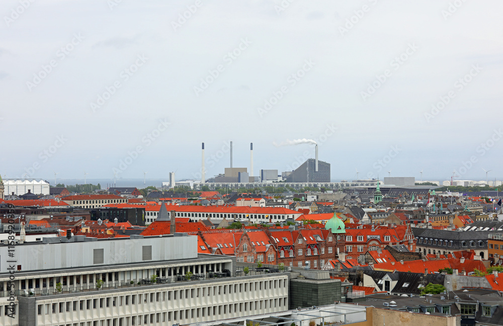 view of the rooftops and the waste-to-energy plant of copenhagen with its tall chimneys
