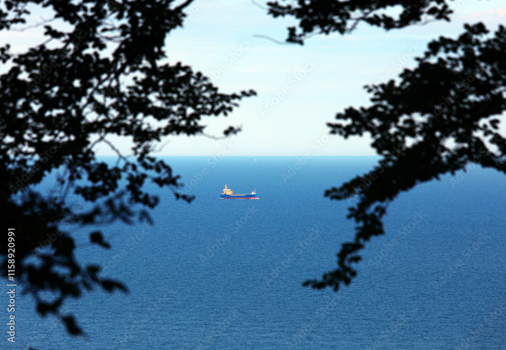 merchant ship sails in the middle of the blue sea between two branches of trees
