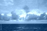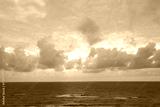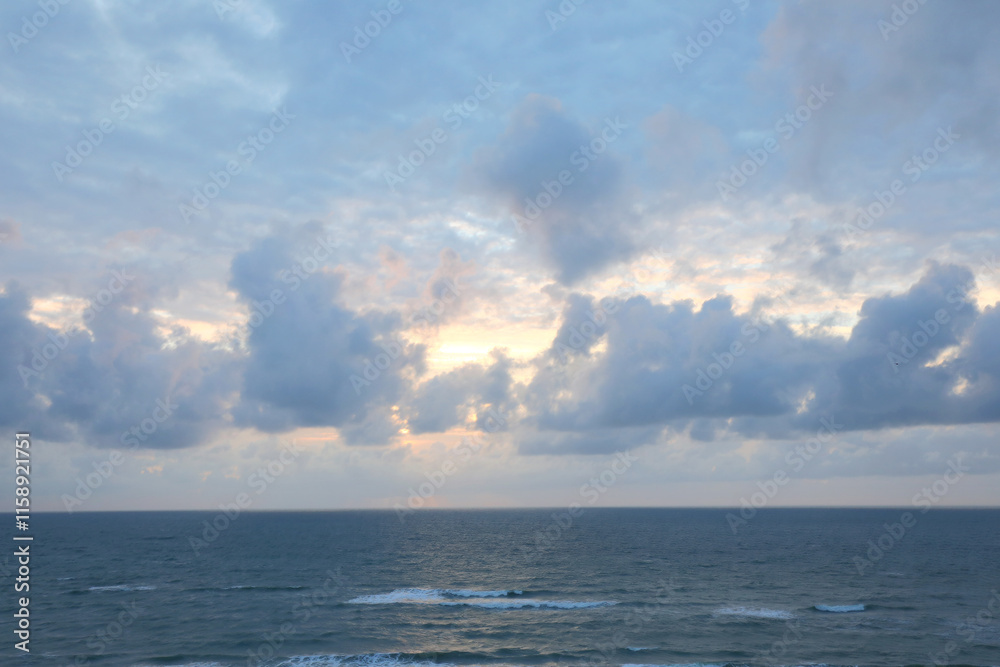 Sunlight filtering through low clouds at sunset and the sea below with some waves, ideal as a religious concept of God