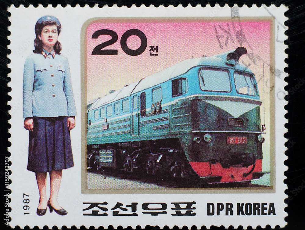Postage stamp, North Korea, railway, 1987, locomotive, conductor, traffic controller