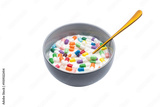 breakfast with multicoloured medicine capsulles in a bowl with milk and a golden spoon