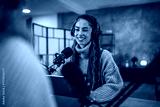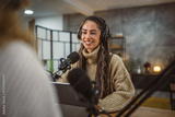 young woman presenter interview female guest and stream audio podcast