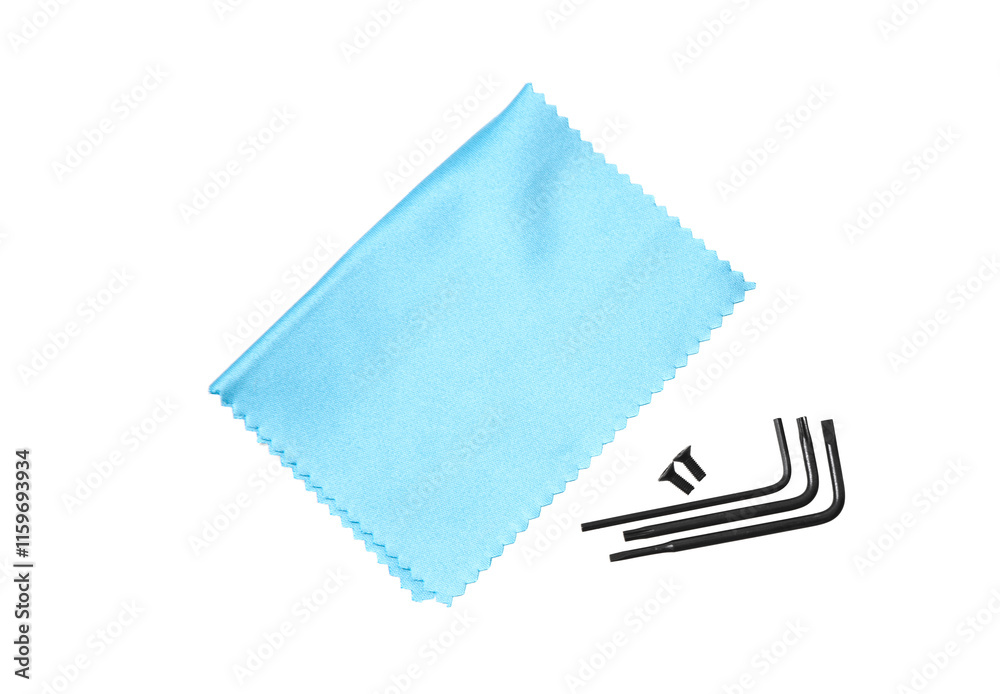 Blue microfiber cleaning cloth and three black hex keys with a small screw, isolated on white background.