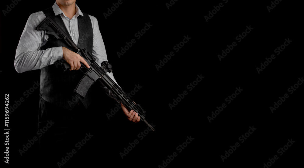 A man in a formal outfit, consisting of a white shirt and a grey vest, is holding a black assault rifle against a dark background.