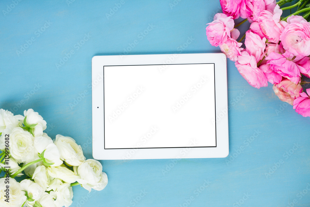 Pink and white ranunculus flowers on blue table styled flat lay scene, retro toned