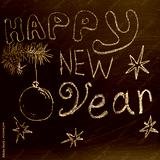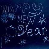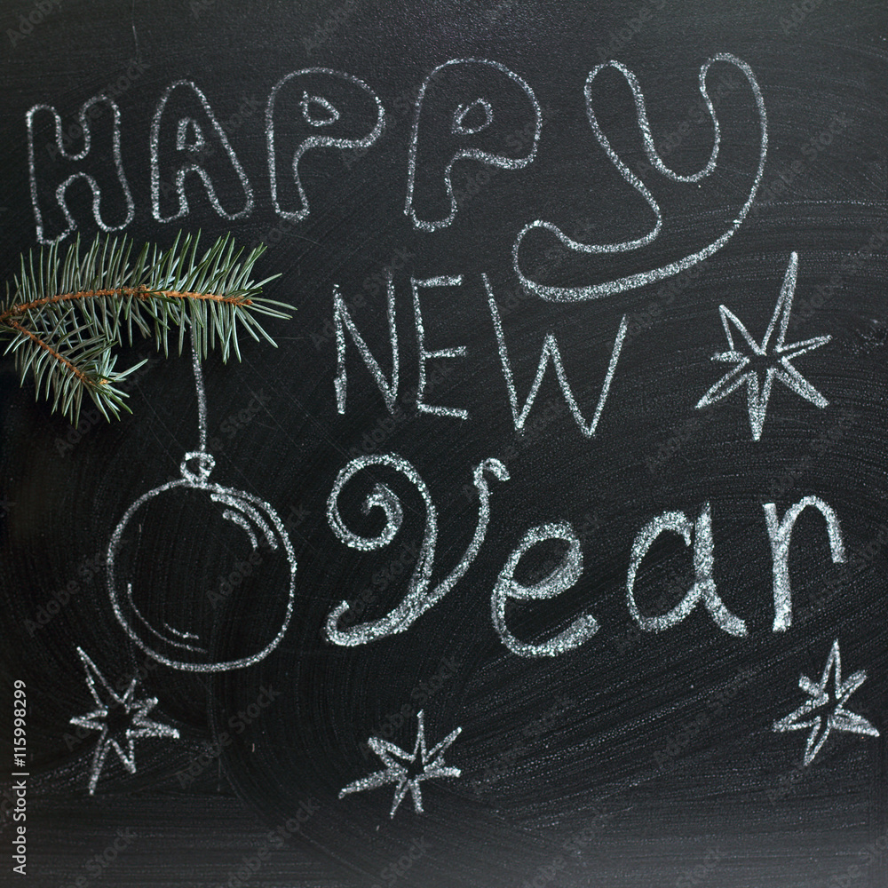 happy new year/ festive background with fir paw and inscription in chalk on a blackboard