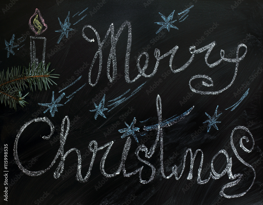 holiday Merry Christmas/ fir branch on a background of a celebratory background drawn with chalk on blackboard