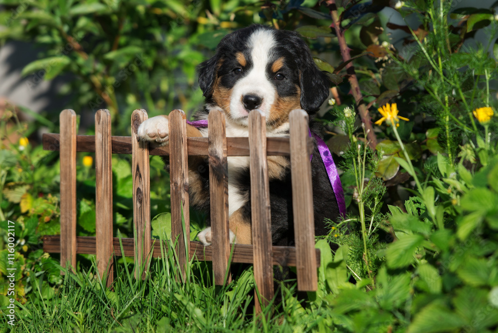 adorable puppy posing outdoors at a fence