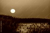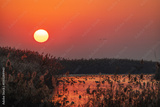 Sunrise view of the wetland, with ponds, reeds and flying migratory birds.