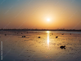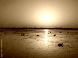 Sunrise scene in the wetland. There are mudflats, lakes, and swimming water birds.