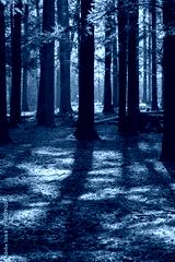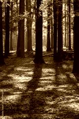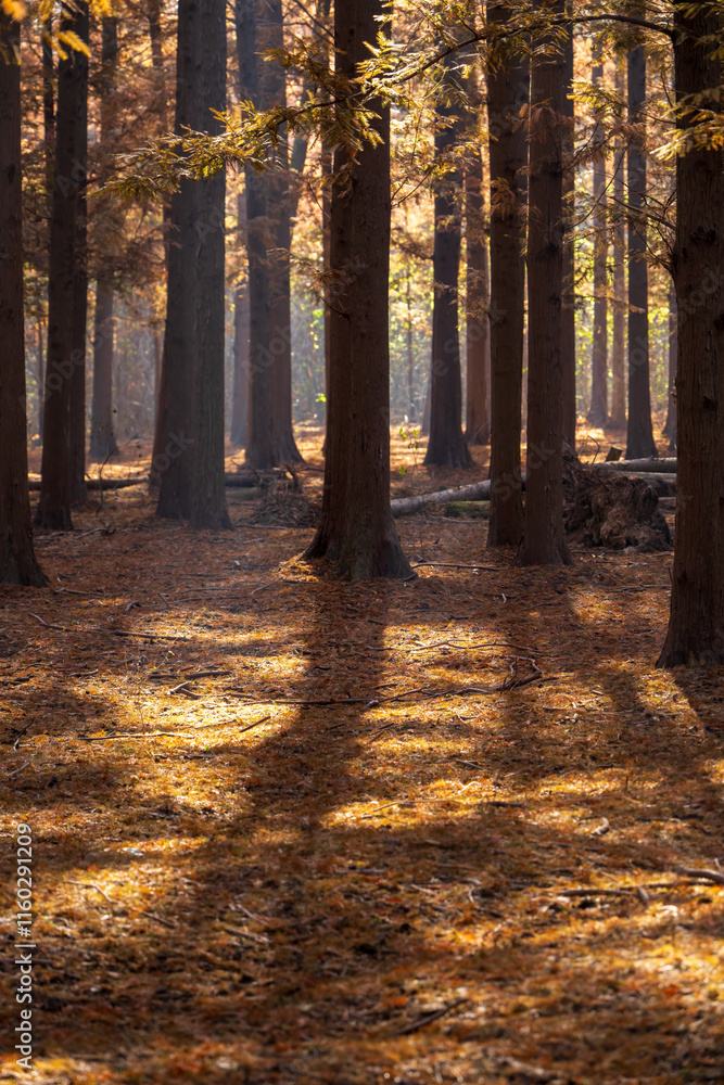autumn in the woods, trees shadow and yellow leaves on the ground