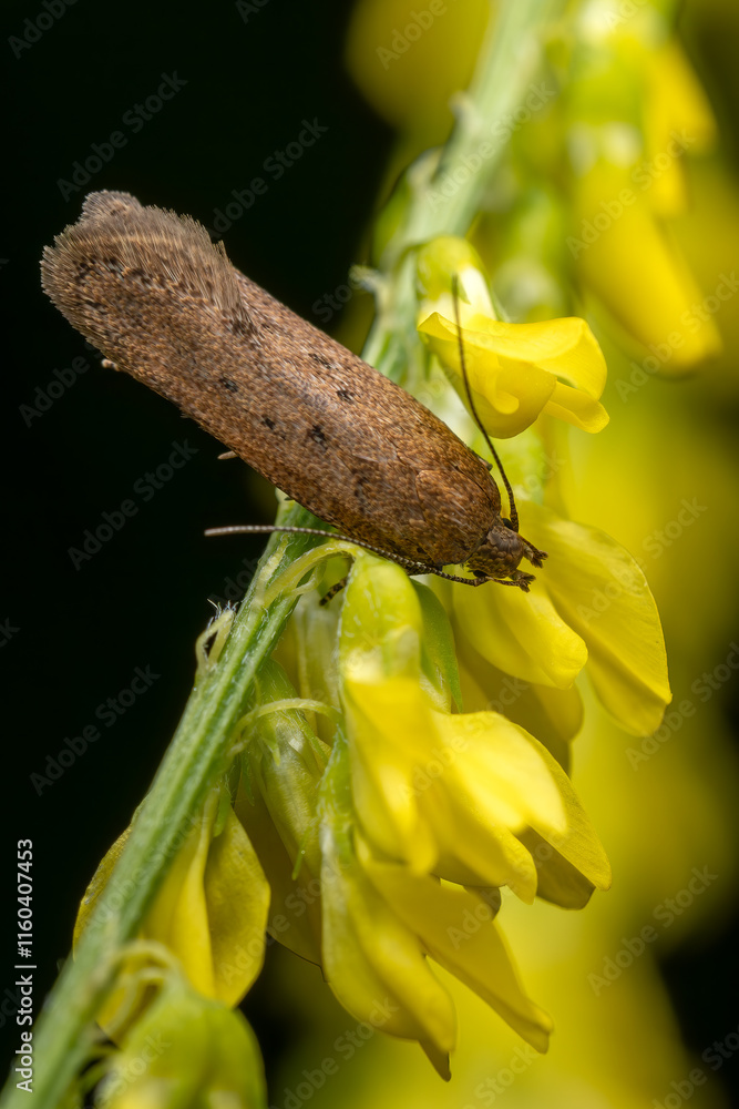 Brown Moss-moth - Bryotropha terrella, small beautiful hidden moth from European meadows and grasslands, Zlin, Czech Republic.