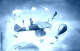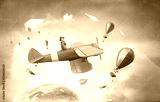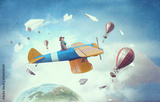 Girl flying old plane . Mixed media