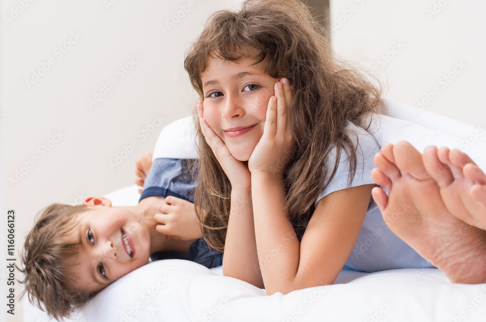 Smiling children lying on bed