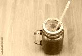 Healthy carrot smoothie in a jar with tube on wooden background. Shallow dof