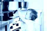 Little child playing with pan and electric stove in the kitchen