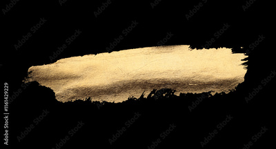 Torn, ripped bronze foil smear brush stroke blot lines. Gold grunge texture stain on black background.