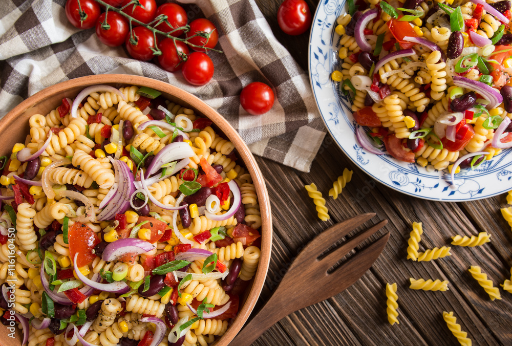 Mexican pasta salad with red bean, corn, tomato, onion and pepper