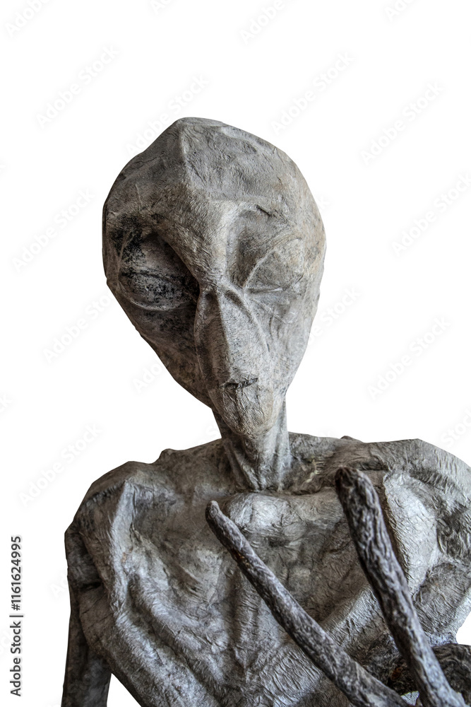 Alien sculpture with a humanoid shape, detailed texture, large head, deep-set eyes, gray stone-like material, and a skeletal body, isolated against a white back