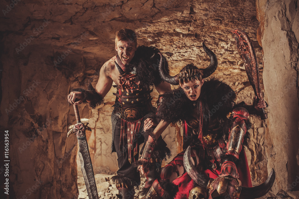 Shouting knights in armor with sword and axe. Catacombs on the b